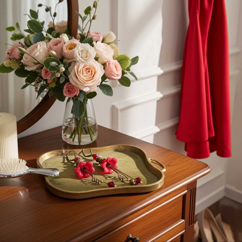 Vintage Victorian Style Siam Red and Antique Bronze Bell Flower Lucite Earrings